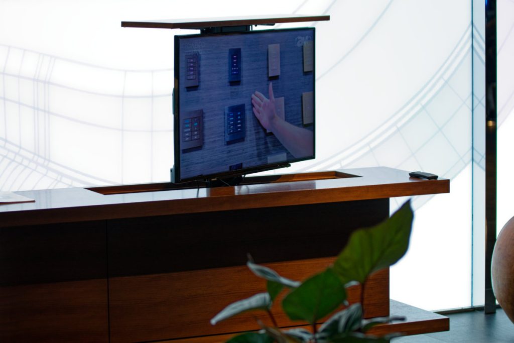 会場では、家具に収納できるリフト式テレビ「Nexus21(ネクサス21)」を使い、来場者にホームオートメーションやミラーディスプレイ「GLAS LUCE(グラスルーチェ)」などを案内していた。