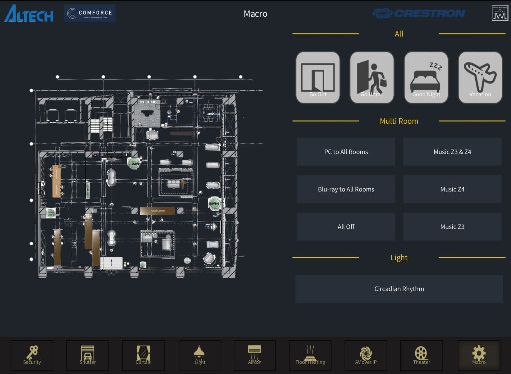 今回のデモンストレーションで制作したUI画面。制作はCRESTRONディーラーのコンフォースが担った