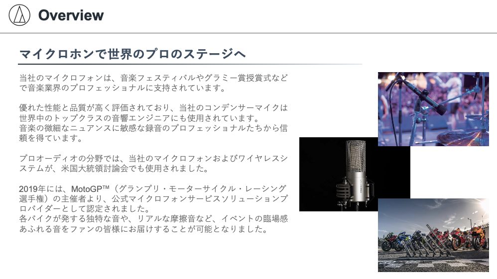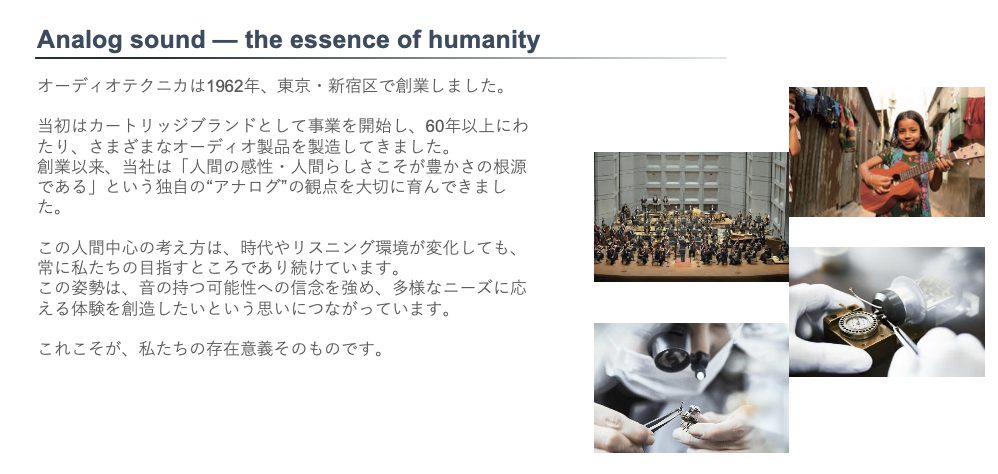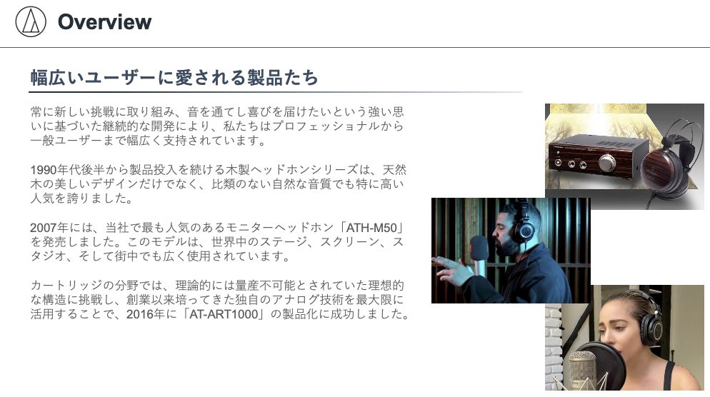 続いて、世界でも数少ないトランスデューサー(変換器。音声を電気信号に変換するカートリッジ=レコード針やマイク、電気信号を音声に変換するヘッドホンなど)を世に送り続けているメーカーであることを紹介。60年以上にわたり、家庭用だけでなく、音声を大切にする世界的な数々のイベントでマイクロホンを中心としたプロ用途にも信頼の製品を生み出し続けてきたことをアピールした。