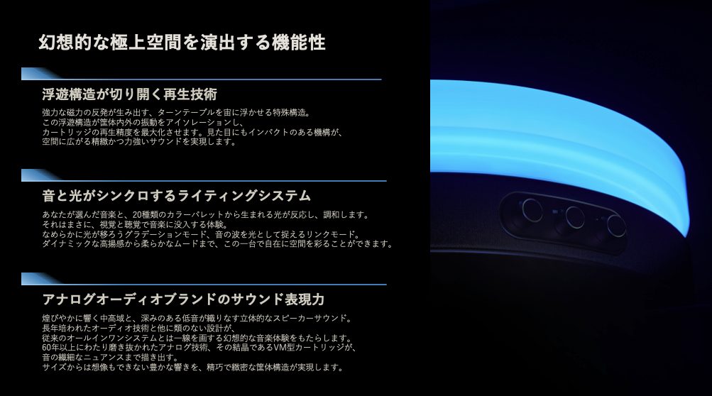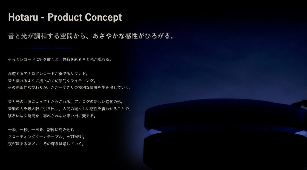 今回展示されたオールインワン・ターンテーブル「Hotaru」は、オーディオテクニカのアナログ思想のまさに象徴であり、浮遊するターンテーブルに載せられたアナログレコードのサウンドと戯れるように煌めく光のマリアージュが、人のアナログ的な感性を刺激する逸品だ。