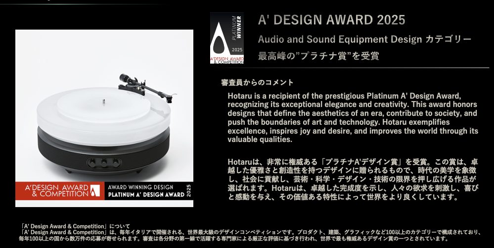アナログ的な価値としての「再現の一回性」を想起させる「Hotaru」は4月のミラノデザインウィーク2025で発表されるや海外で話題になり、「A’ Design Award & Competition 2025」においてAudio and Sound Equipment Designカテゴリー最高峰の『プラチナ賞』を受賞した。