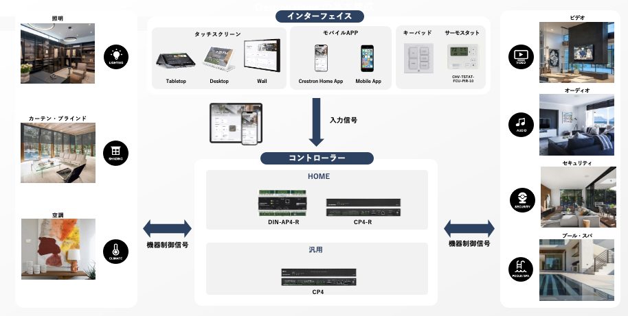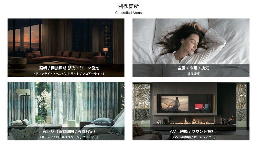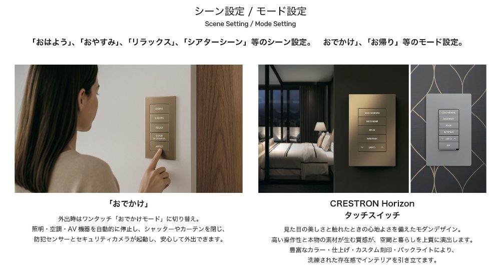 「CRESTRONは、ホワイトハウス、五つ星ホテル、超高級住宅などで採用されているホームオートメーションシステムです。照明、カーテン、音楽、映像、空調といった住宅設備をひとつのアプリで直感的にコントロールできます。しかも、複雑な操作は不要で、ワンタッチでシーンが立ち上がり、空間全体が理想の状態に切り替わります。ひとことで言えば、『すべてが思い通りになる家』が実現できるのです」