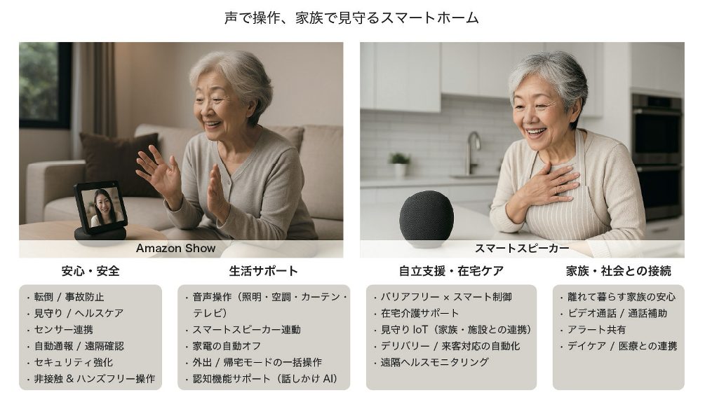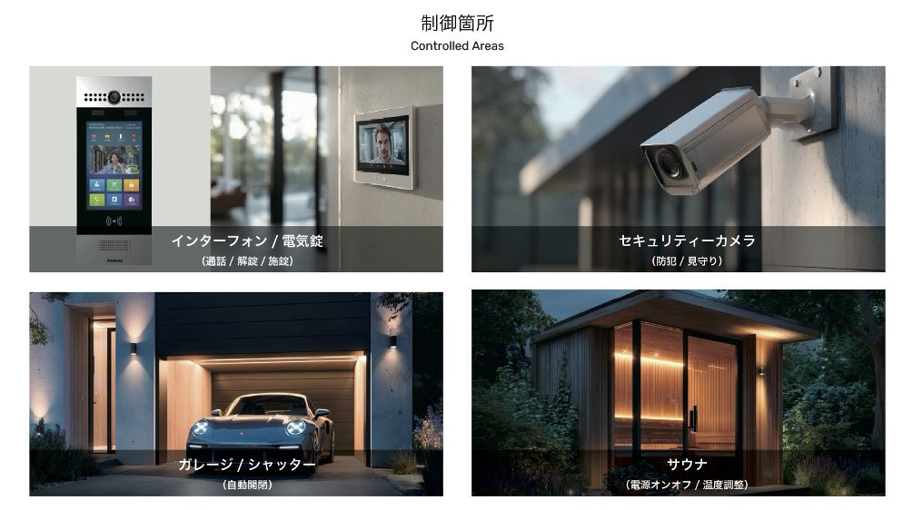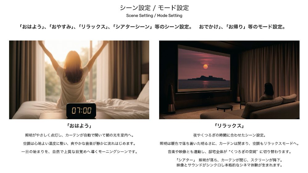 「(1)いままでのスマートホームは、照明や空調、テレビ、窓周り、インターホン、電子錠、カメラ、ガレージ、シャッター、浴室といった施設の個々の設備を遠隔で動かすものでした。しかし現在のスマートホームは、予め設定した「シーン」をたったひとつのトリガーとして、その場に合った環境を実現します。例えば、「おはよう」というシーンですと、カーテンが自動的に開いて朝の光が入ってきて、室温調整ができるようになり、爽やかな音楽が鳴っているといった環境に変わります。こういうのを一つの「シーン」で呼び出す。「リラックス」「お出かけ」「お帰り」といった「シーン」を、ひとつのタッチでできるようになりました。