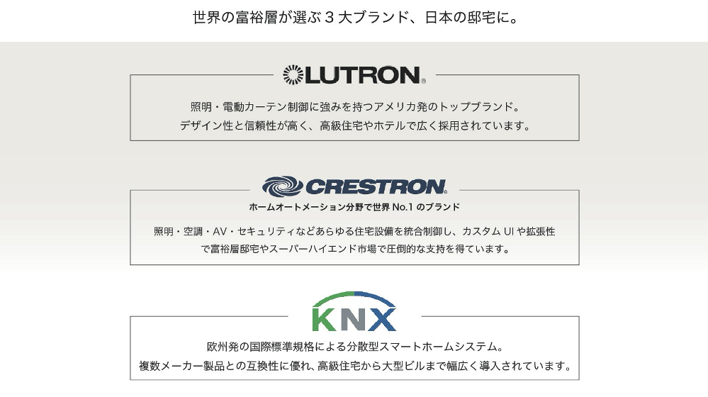 「(3)Hanamuraでは、さきほどプレゼンテーションがあったCRESTRONのほか、LUTRON(ルートロン)やKNX(ケーエヌエックス)を含む世界3大ブランドを取り扱っており、お客様のご要望に応じたホームオートメーションを構築できます」
