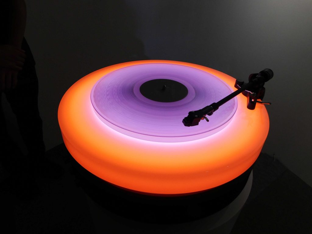 照明システムの灯りがアナログの再生とリンクして色を変えるというフォルムが、「音を聴く」という行為に加え「視る」という次元を付与する。ターンテーブル/レコード再生機器という枠を超え、「インテリア」としての表情をもたせる。