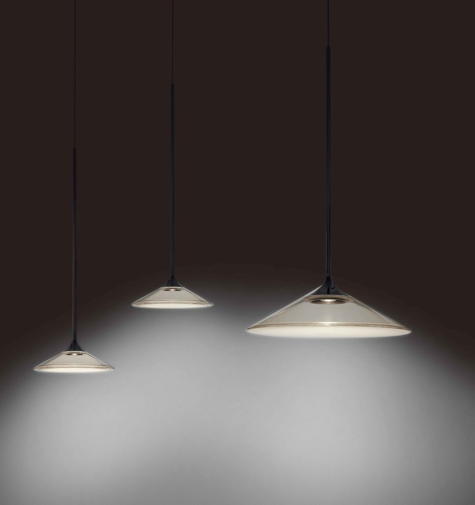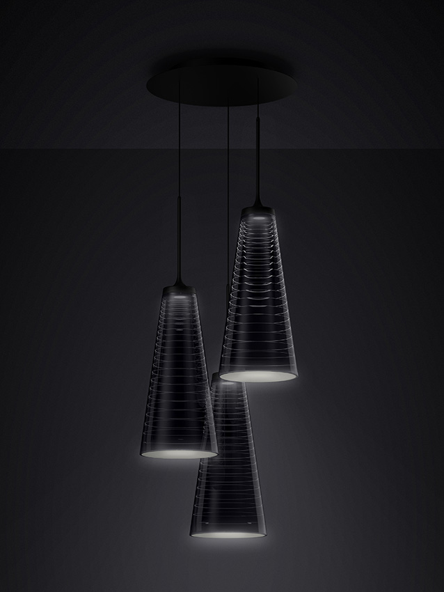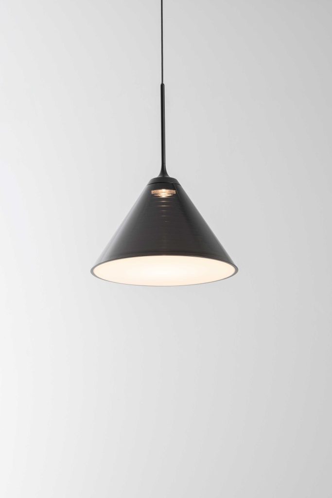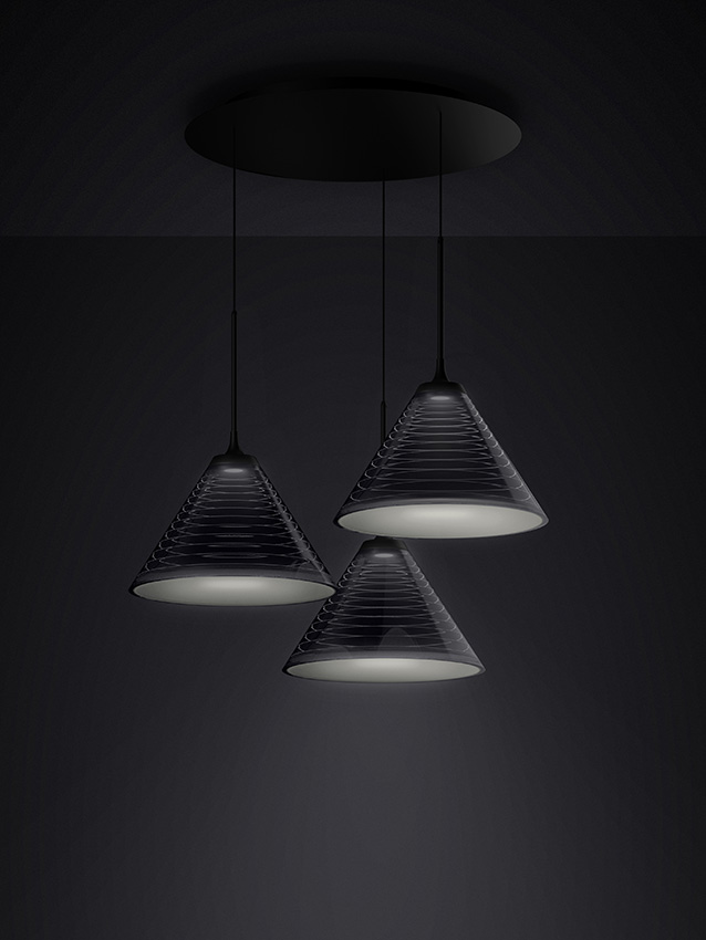 三角錐のシェード内部に設けられた段差が、レンズを通した光を反射・屈折させ、直接照射ではなく“線”として明るさを伝える。結果として、下方向への照度を確保しながら、光自体が彫刻的な表情を持つ。