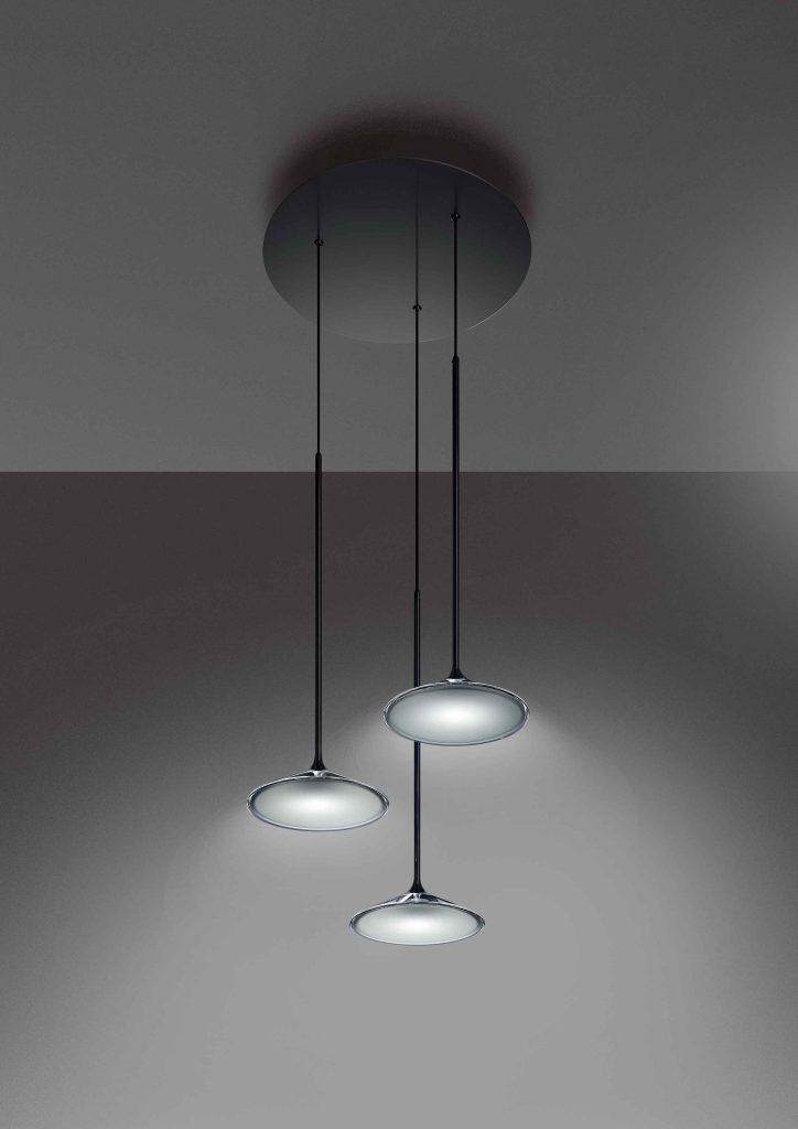 光源が見えず、円盤のように浮かぶ造形は、昼と夜で異なる表情を見せ、ラグジュアリーなリビングからホテルラウンジまで、多様なシーンに呼応する。