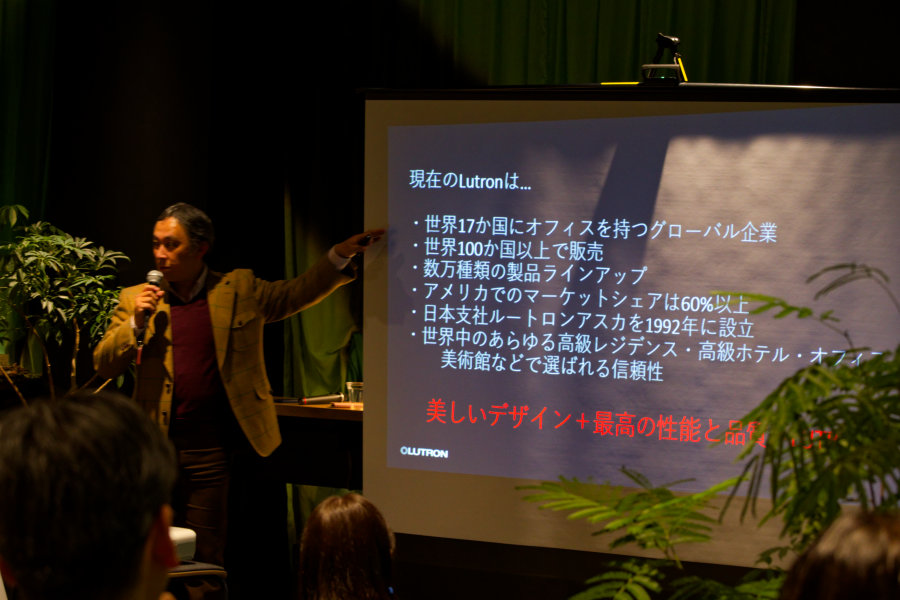冒頭挨拶に立ったのは、アメリカ本国のルートロンエレクトロニクス(Lutron Electronics Co., Inc.)のAsia Pacific Senior Sales DirectorのPhilip Sun氏。日本担当になって12年になる。