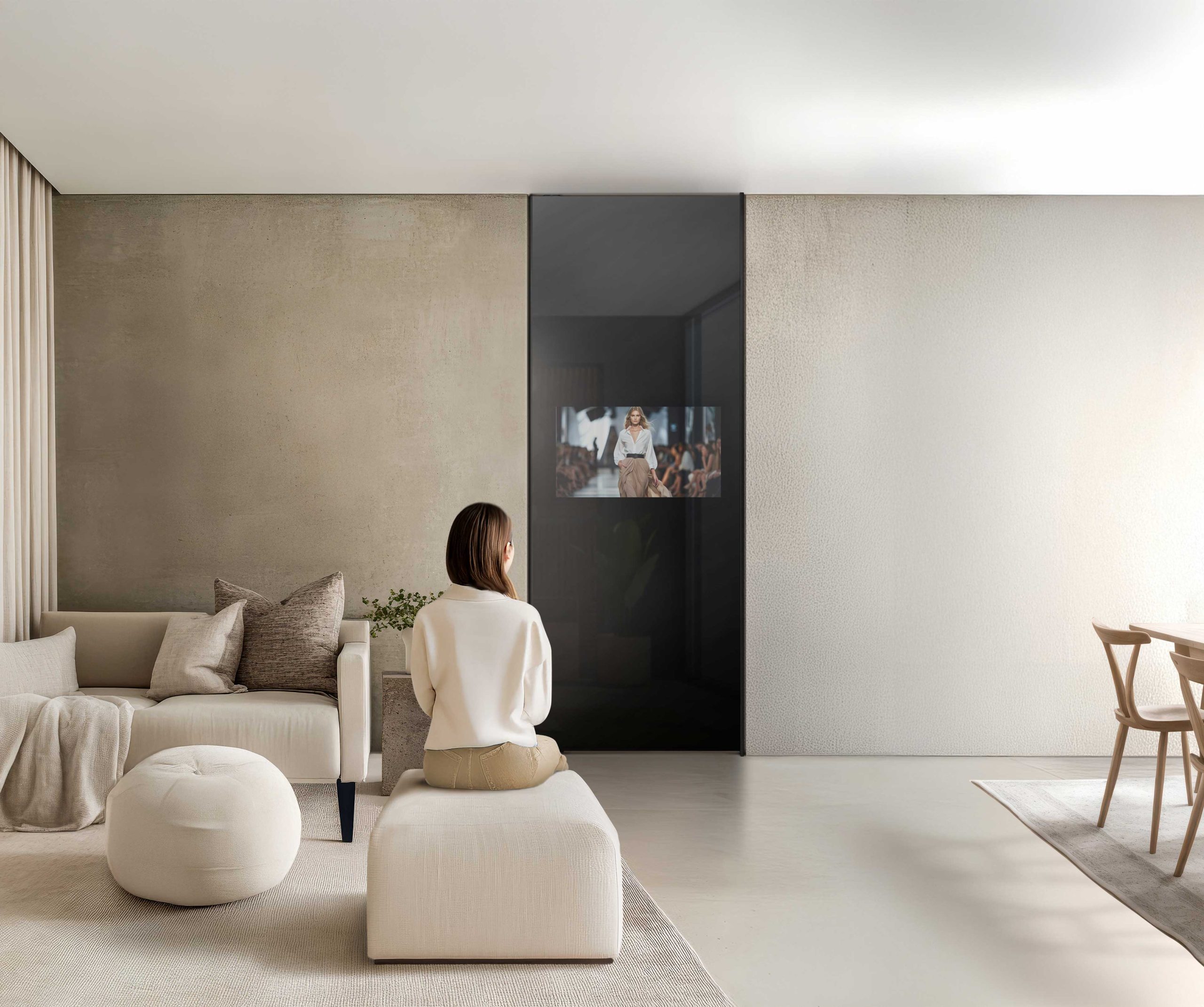 普段は静謐な面として佇み、点灯すれば映像が立ち上がり空間の意味を変える──このダイナミズムこそ“映す器”の本質である。