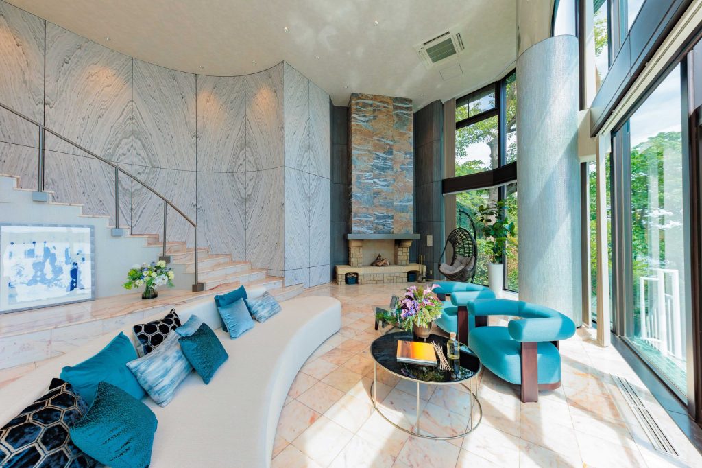 波の曲線をモチーフにした特注ソファ、重厚なイタリア製タイルテーブル、シンボルティックな暖炉が、圧倒的な開放感にクラシカルな重みを添える。
