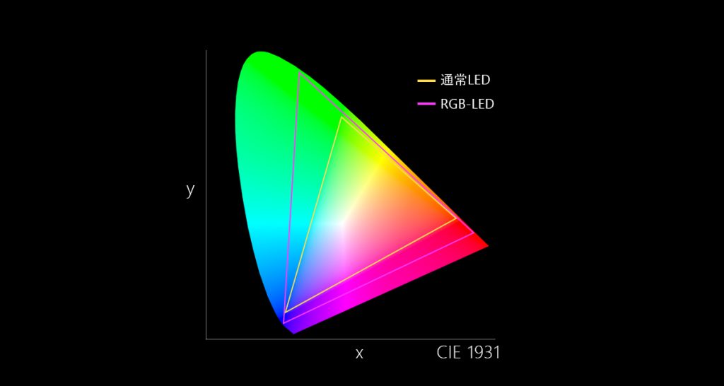 高色純度で発光する直接発光型RGB LEDを採用することで、自然界の豊かな色彩から夜景の光のニュアンスまでリアルに再現する