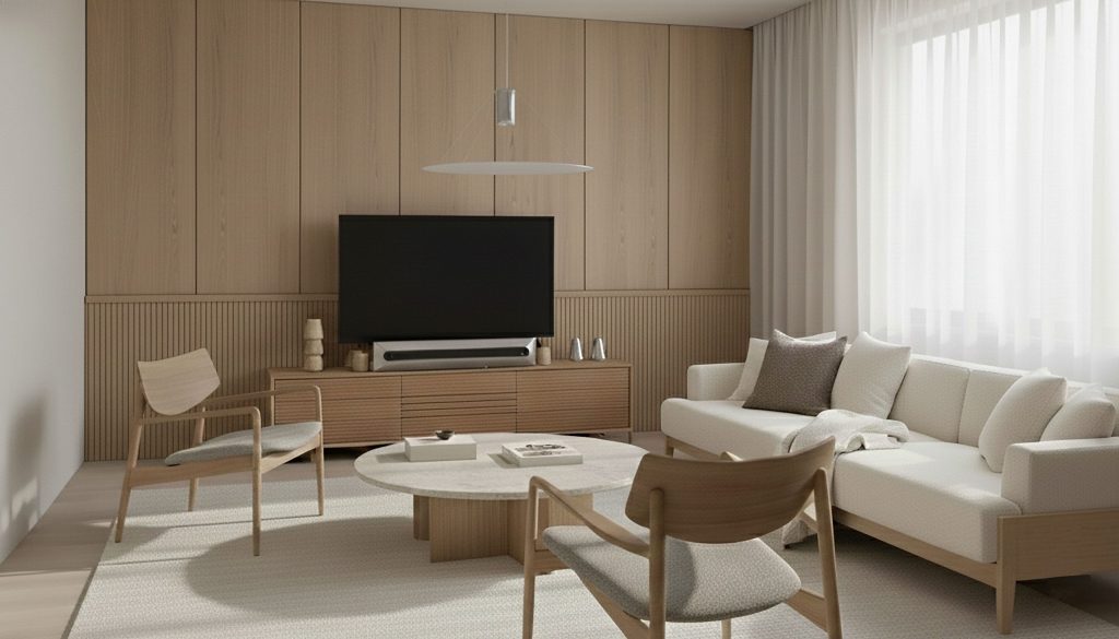 サウンドバーをテレビ台に置くことで画面が隠れる──そんな“インテリア上の悩み”を解決し、空間に自然に溶け込む専用家具とスタンドを開発中である。