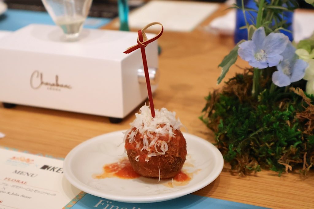 例えば「FLORAL」のセッションでは、ラベンダーやカモミール、ローズを中心としたフローラル系アロマと共に、アンガス&ジュリア・ストーン「Chateau」が再生され、トマト系のフード「トスカーナ風パッパ・アル・ポモドーロとモッツァレラ」が提供された。
