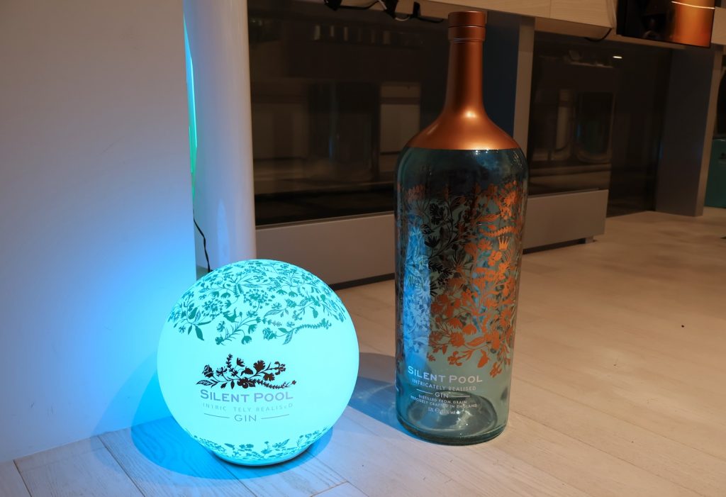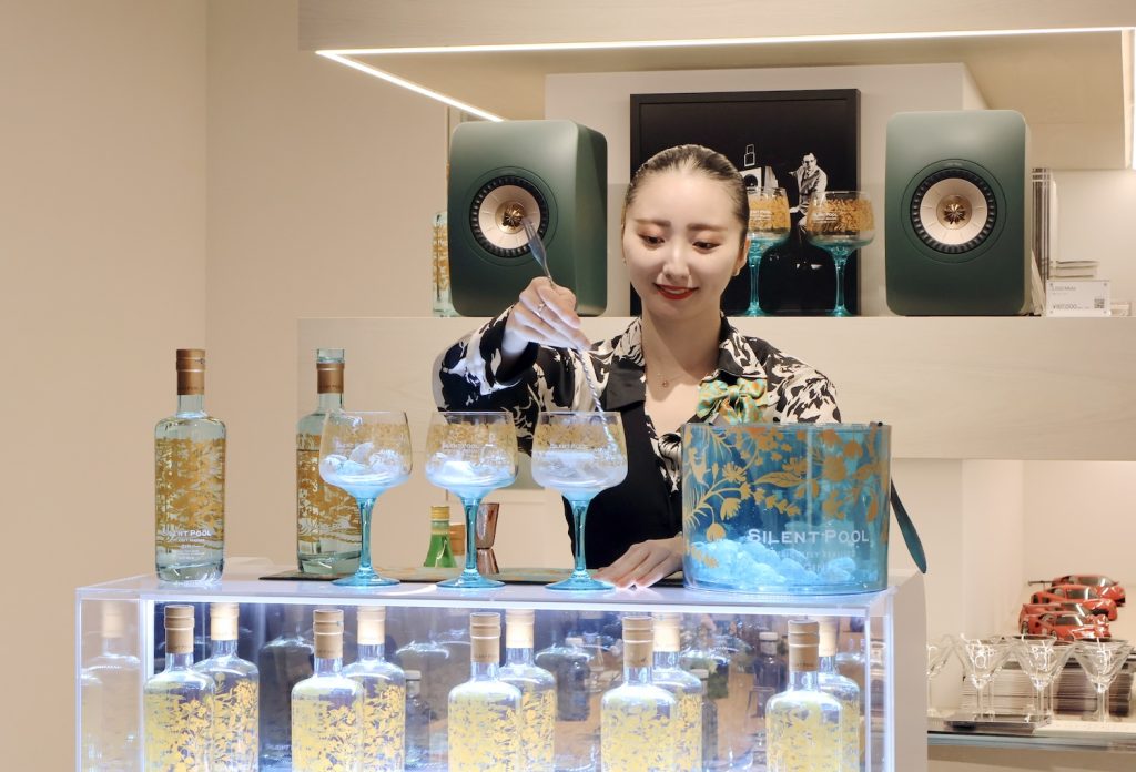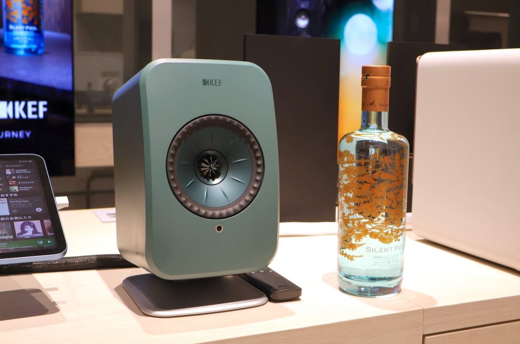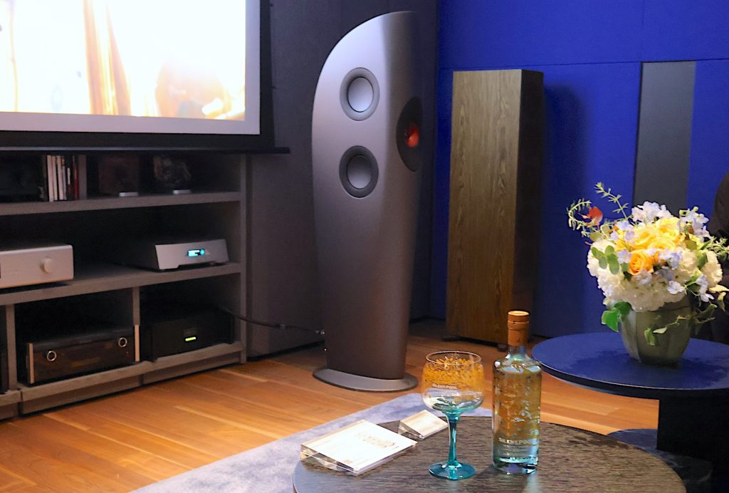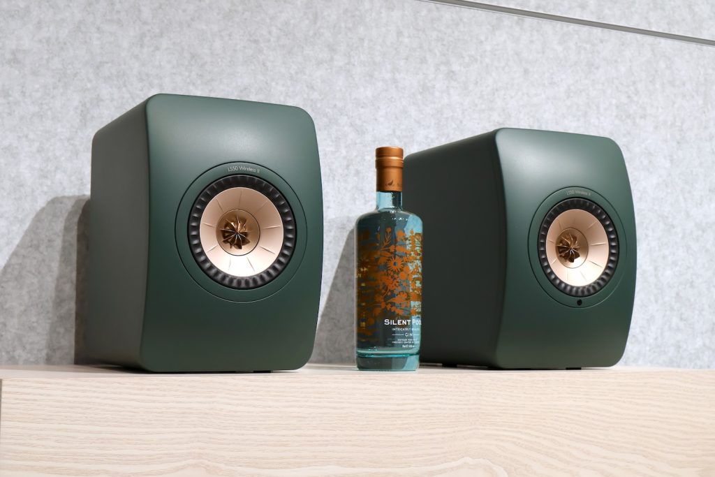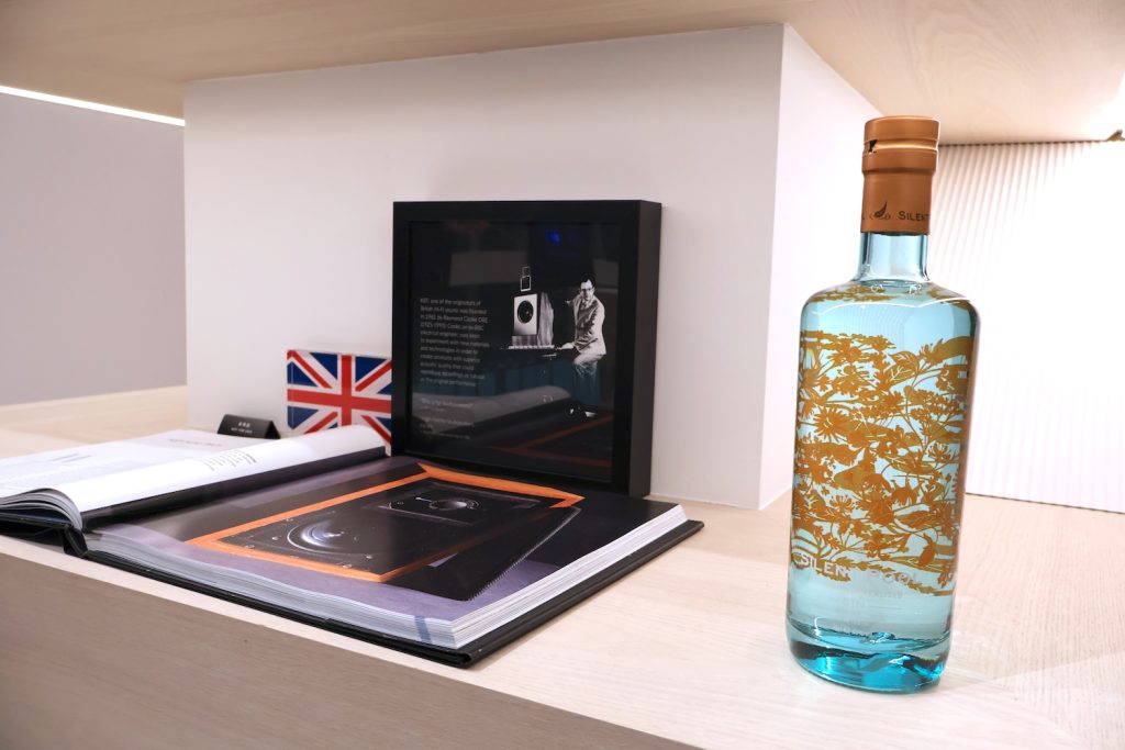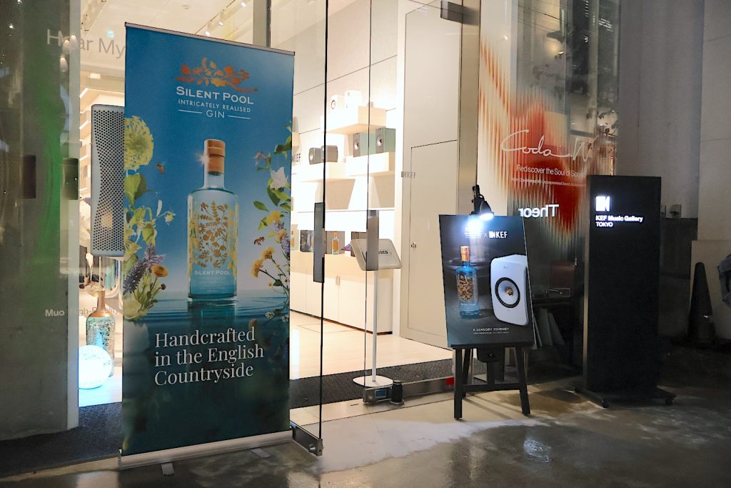 今回は、同じ英国の高級ジンブランドであるサイレントプール ジンとのコラボということで、会場内にはKEFのスピーカー群と共に、サイレントプール ジンのボトルが立ち並び、来場者を迎えていた。