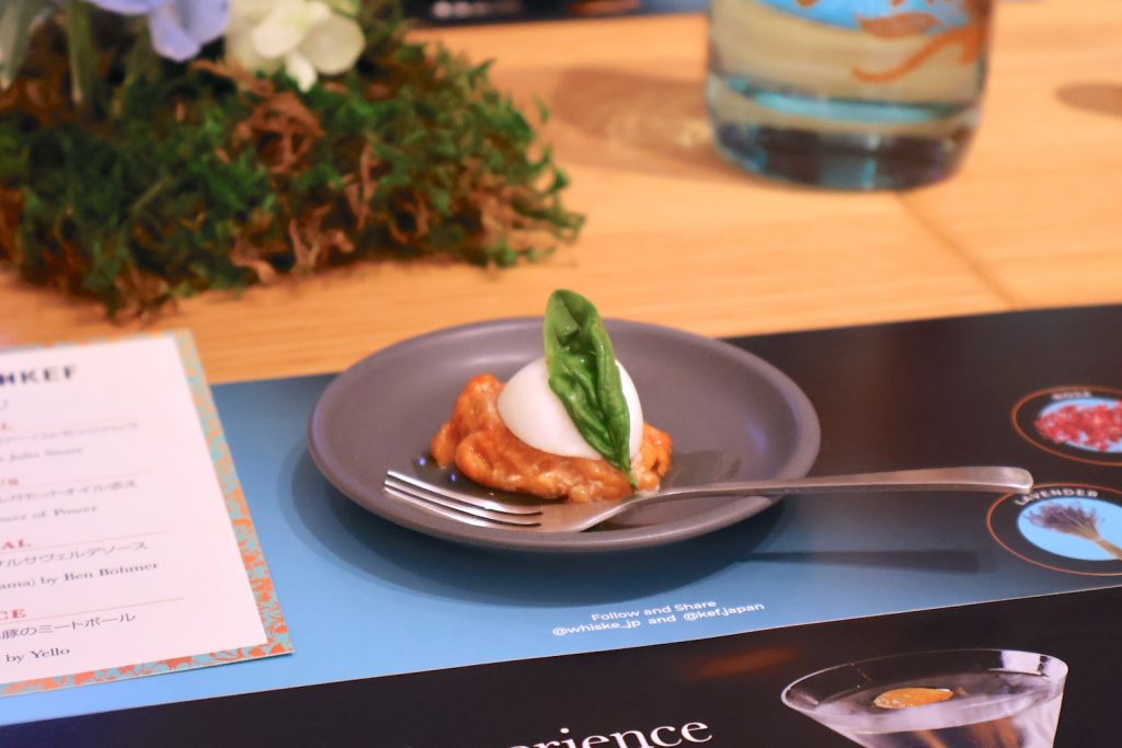一方、「SPICE」のセッションで登場したのは、樹脂感のある香りのジュニパーに、辛みのあるグレインズ・オブ・パラダイスなどを融合させたスパイシーなアロマ。そこに組み合わせる音楽はイエロー「The Race」、フードは「北海道産蝦夷鹿と黒豚のミートボール」が提供された。