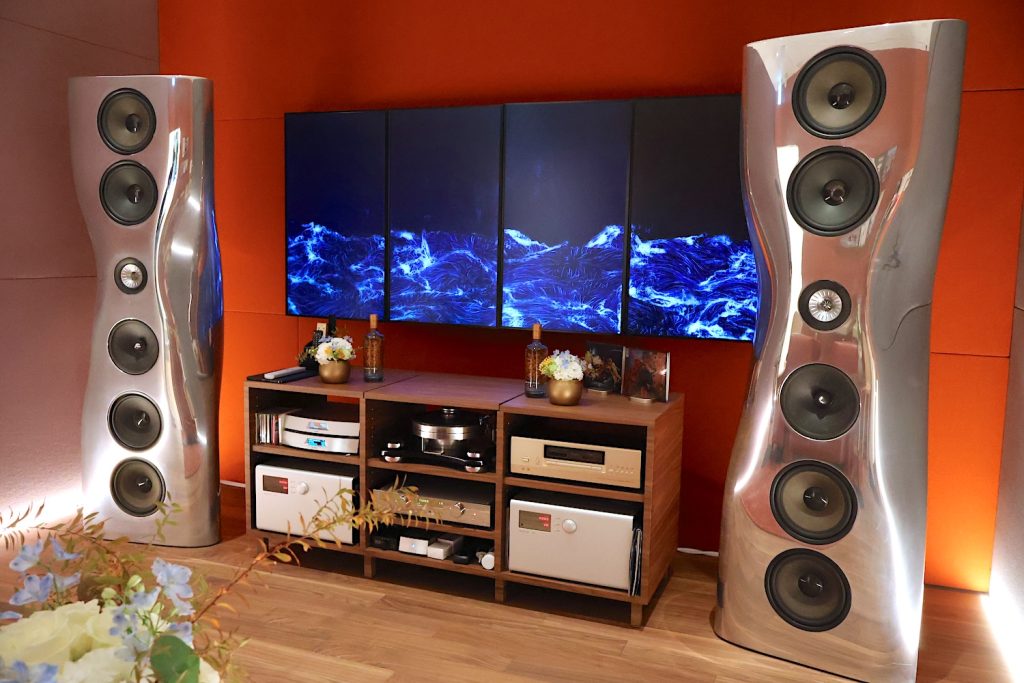 KEFのスピーカーといえば、独自のUni-Q同軸ドライバーもデザインアクセントの一つとするスタイリッシュな佇まいが有名だが、そこにサイレントプール ジンの世界観であるエメラルドグリーンとゴールドの光が加わることで、英国の美しい田園風景を思わせるラグジュアリーな空気感が演出されていたのが印象的だ。