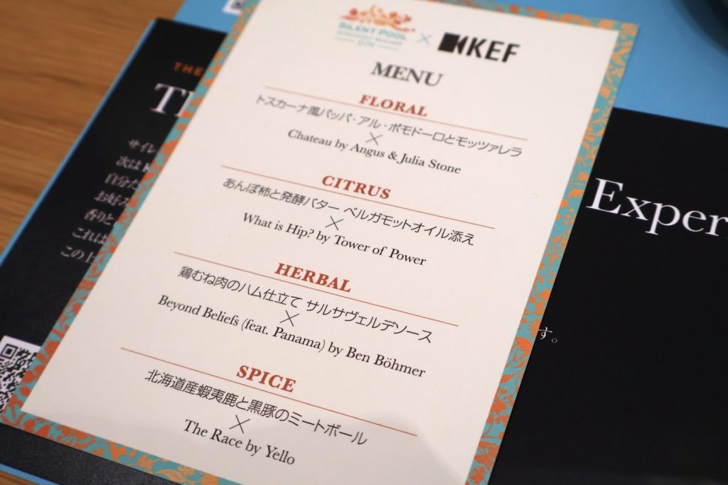 メインとなる音・香り・味のテイスティング体験は、大きく3部構成で進行。第1部では、KEFのサウンドとサイレントプール ジンの味にまつわる紹介を聴きながら、実際にサイレントプール ジンのテイスティングが行われた。