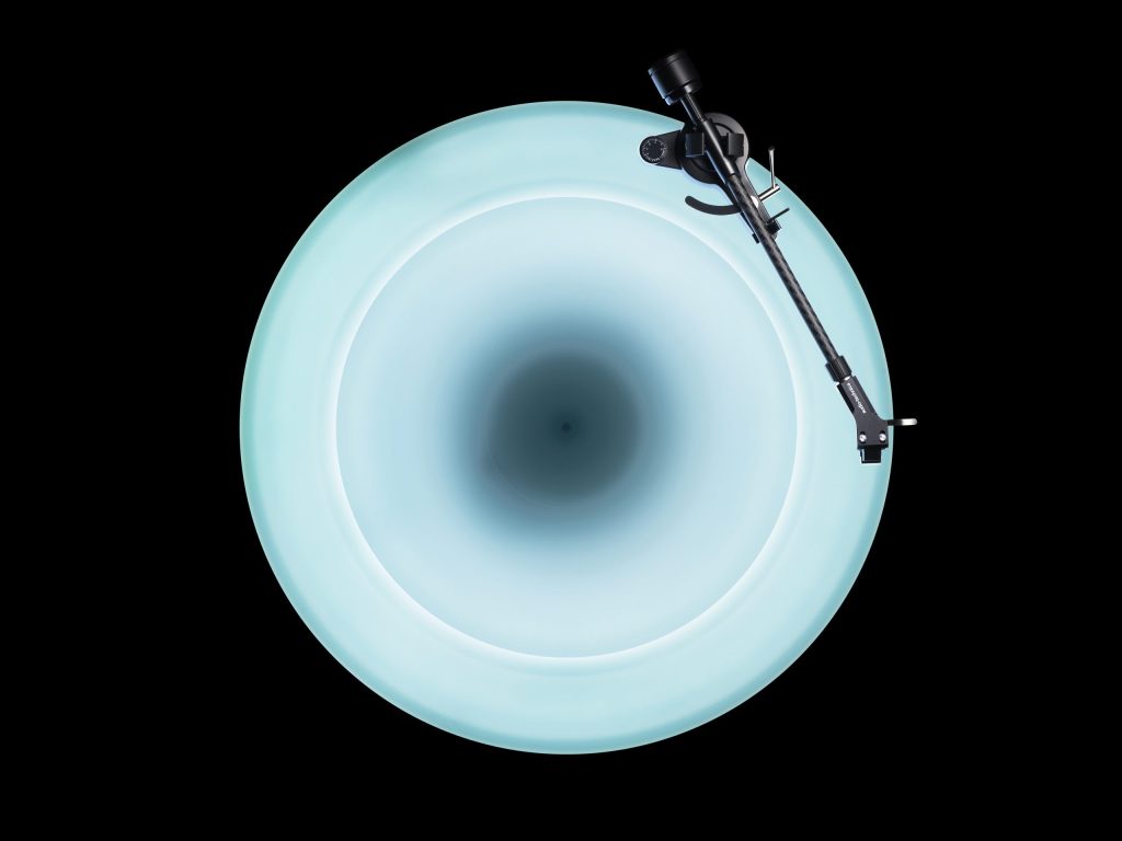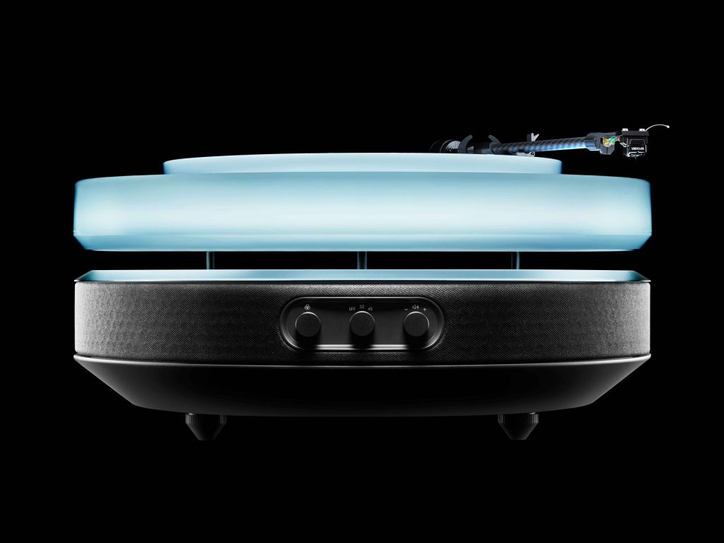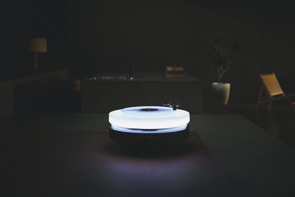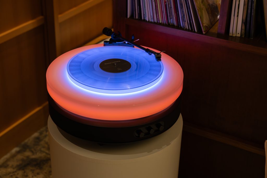 浮かぶターンテーブルと照明、そしてスピーカーが視覚と聴覚に語りかけ、心に贅沢な時間と体験をもたらす。