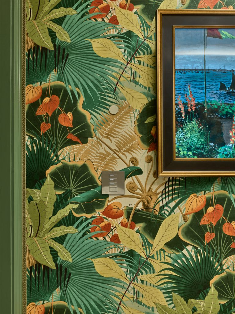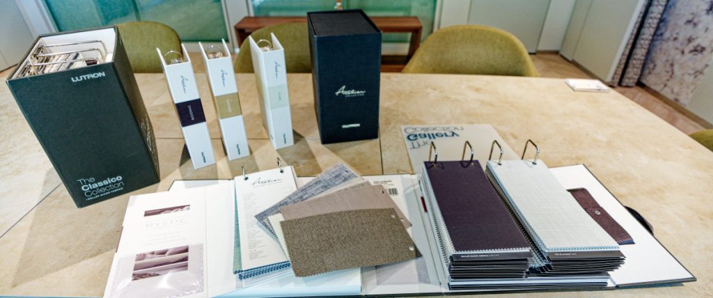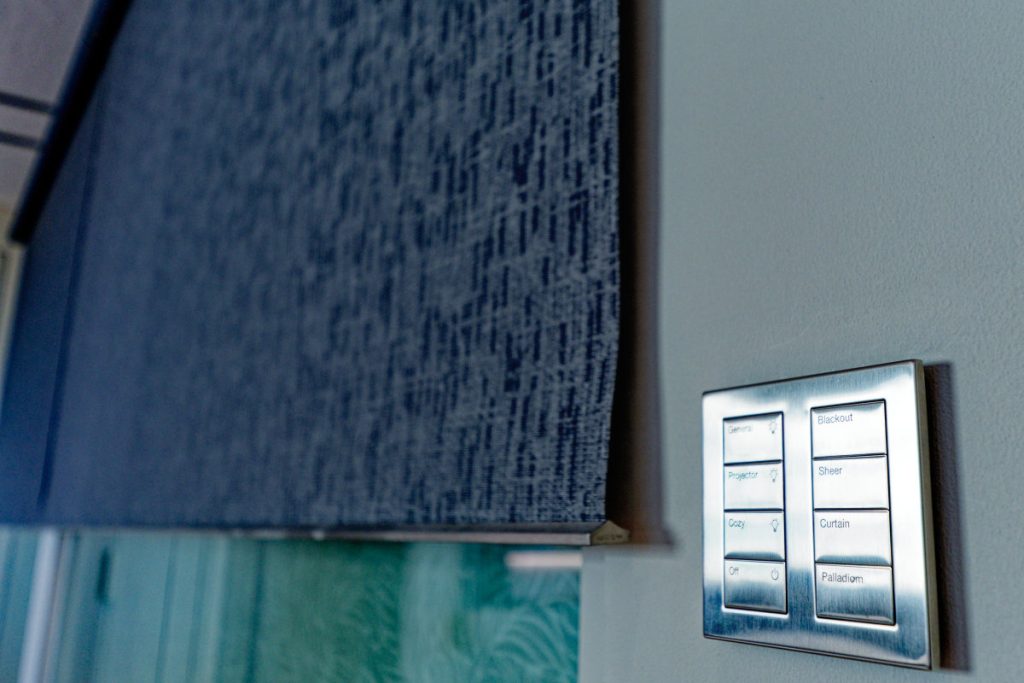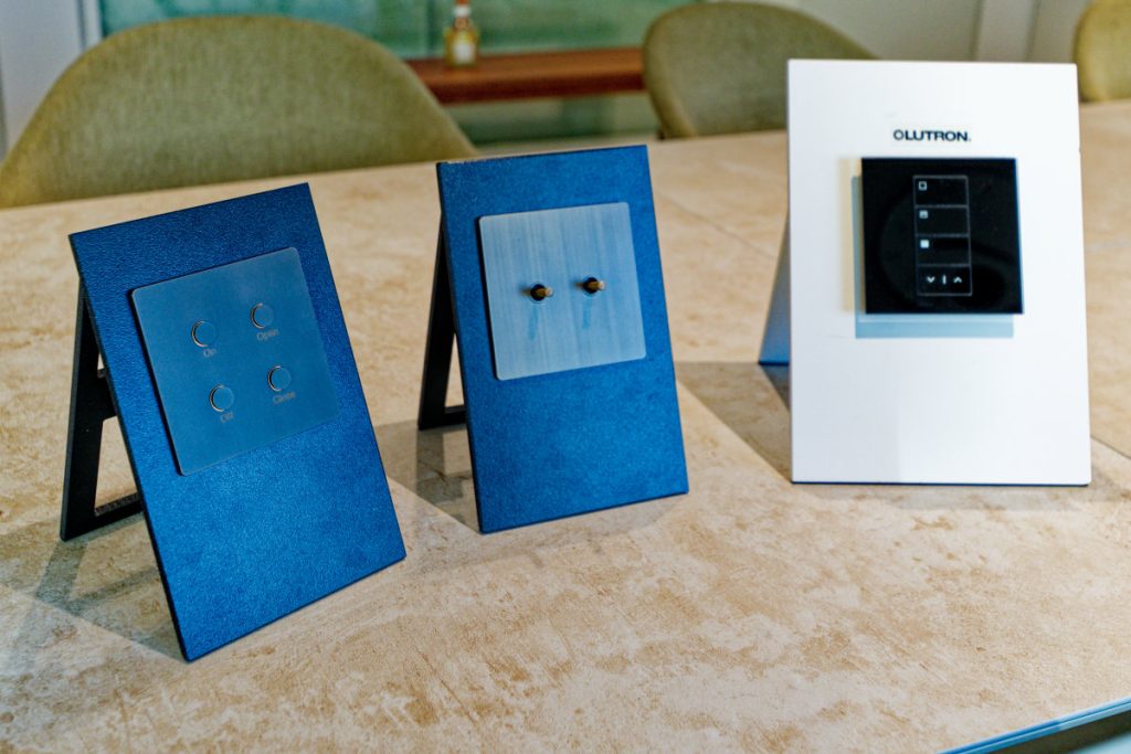 ルートロンは外光制御のカーテンも自前で用意。壁のキーパッドでもシアー/ウッドブラインドの羽の角度を変えられる