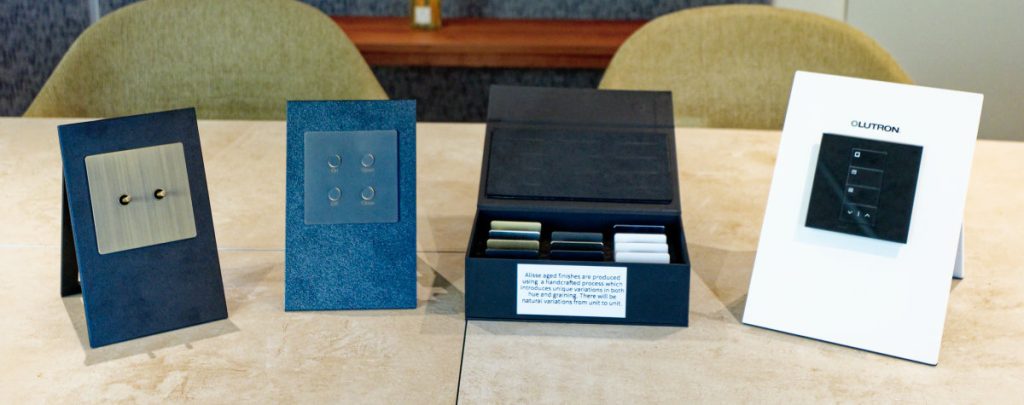 写真左がハンドメイドな仕上げと彫り込み文字にバックライトが印象的なHomeWorks専用のプレミアムキーパッド「Alisse(アリース)」。中央が新製品、クラシカルなつまみながら機能は上/下や長上げ/下げなどプログラミング可能な本格的スマートスイッチ「Aviena(アヴィエナ)」