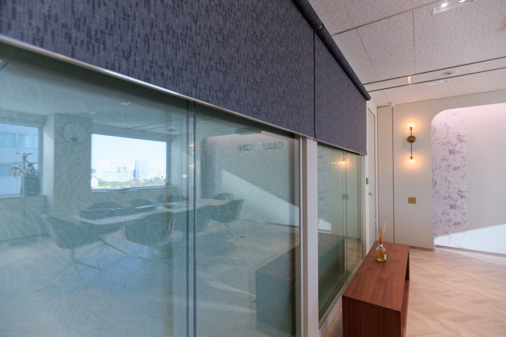 電動ロールスクリーン「Palladiom(パラディウム)」。動作していることが分からないほど超静音で上下に動作する。素材のバリエーションも豊富