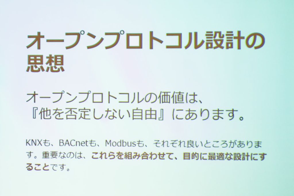 だがせっかくKNXで繋ぐのであれば、KNXnet/IP(KNXのフレームをIPフレームにのせたもの)、新しいKNX IoT等もある旨紹介された。