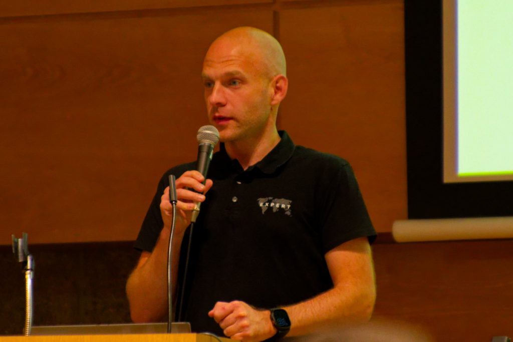 胸に「EXPERT」を掲げたエンジニアで、新しいKNX IoTにより可能になった接続法を、実機を繋ぎ実際に動作させながら説明した。