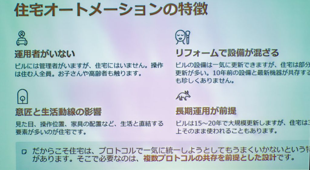 KNXの魅力は、長く使えるので運用が安定すること、特定メーカーの都合に切り回されないこと、つまり将来の変化を許容する柔軟性が、住宅のオートメーションにとって有効だという。