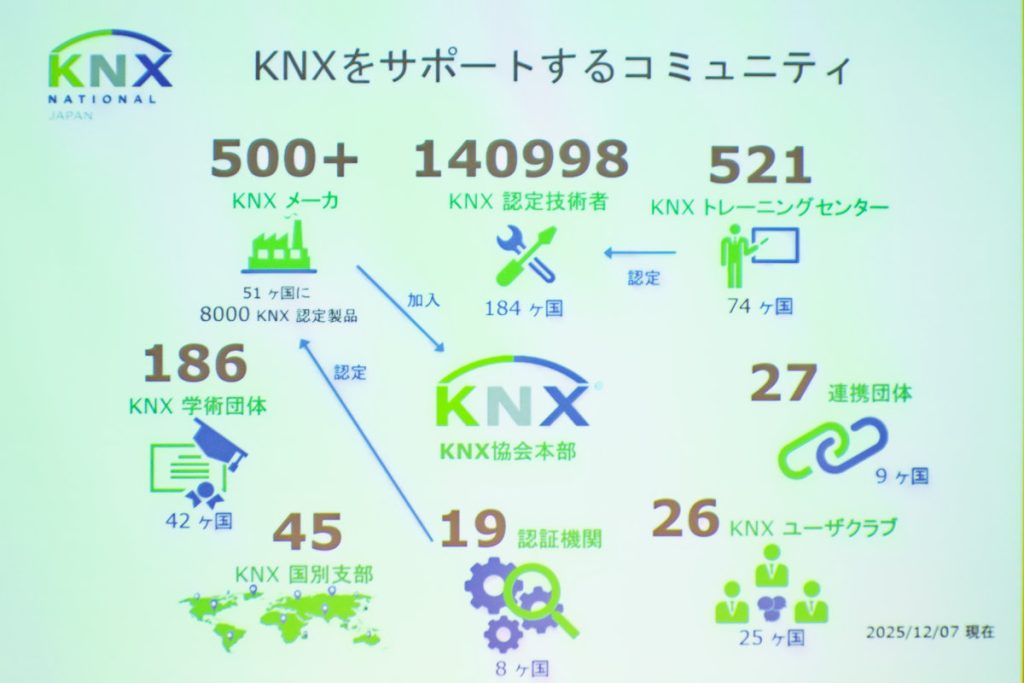 ヨーロッパ発の国際オープンプロトコル「KNX」の最新動向を共有する日本KNX協会主催イベント「KNXフォーラム東京2025」が、2025年12月9日、東京・三田の建築会館で開催された。住宅やビルなどの設備を自動制御するヨーロッパ発祥のオープンプロトコルであるKNXの規格制定から35周年、日本KNX協会設立11周年となった今年の東京フォーラムは、昨年を上回る110人あまりがホールを埋め尽くした。KNXの基礎から、スマートビル・スマートホームへの応用、BMS連携、最新KNX IoT、NOT A HOTELの実装事例まで、オープンプロトコルがもたらす“長く使える建築オートメーション”の現在地が語られた。