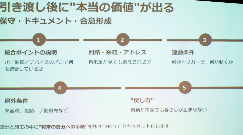 住宅設計や照明設計などそれぞれに専門家がおり、それぞれの境界線をハッキリさせることが、長期に亘る管理では大切だと力説。
