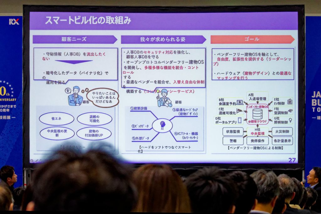 講演「スマートビル – 想像から創造、実装に向けて – 建物オーナーが求める建物OSとオープンプロトコル」では、オープンプロトコルの重要性と、建物OSの果たす役割についてのセッションが行われた。