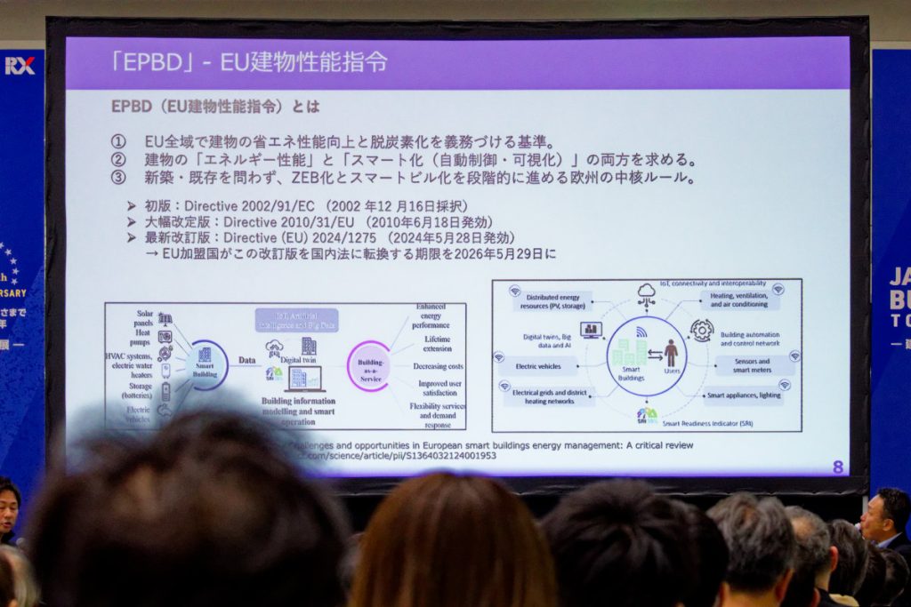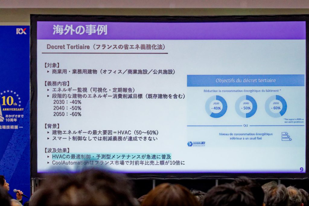 「EUでは建物エネルギー性能指令(EPBD)というのがあり、それに沿ってフランスでは2030年までに6割に削減することが法律で決まっているんです。空調は最もエネルギー消費が大きいことから、実際フランスではCoolAutomationの売り上げが前年比10倍になっています」と実情を紹介した。