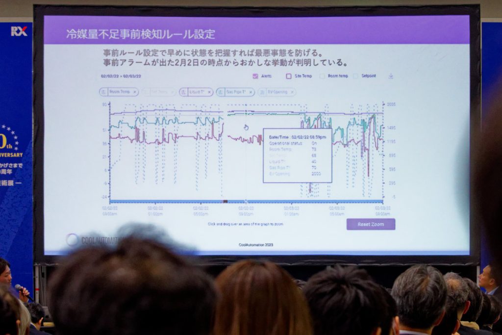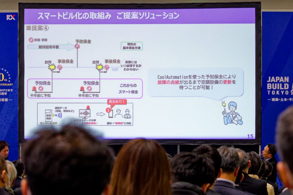 具志さんから「『まだ使えるのに定期的に交換するのは勿体ない。かといって故障してからだとトラブルになる。予兆を察知して予算効率的に交換できないのか』といった相談を受けるが、解決方法はあるか」と問われると、横山さんは、空調に於いてはCoolAutomationならば応えられることを紹介。