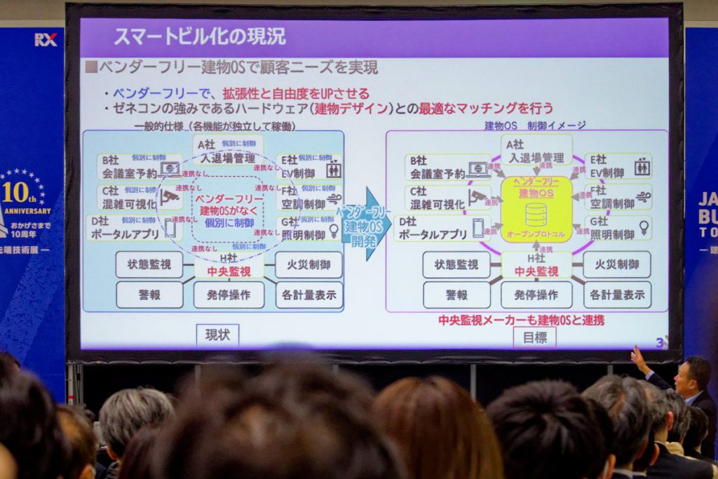 建物というハードが主戦場である具志さんは、「個別に制御している現状(写真左の青枠)を、お客様の多岐に亘るニーズに応えるためにも、集中制御できるベンダーフリー(メーカーに依存しない)建物OSによるスマート化(写真右の赤枠)を構築しなければと思っています」と問題提起した。