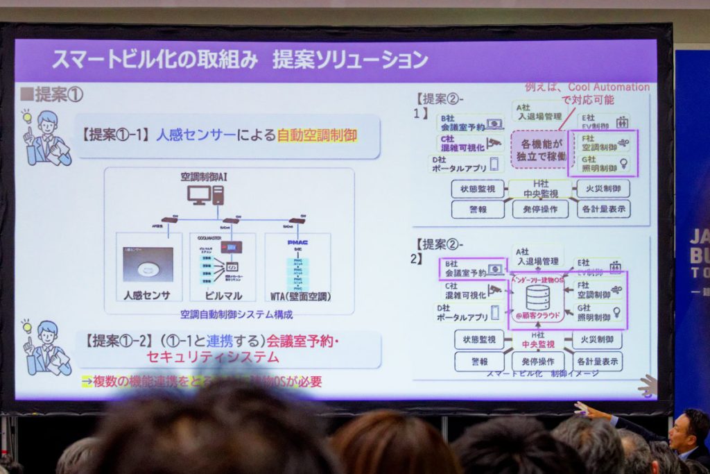 続いて、「会議室のカギが返却されても空調や照明を消し忘れている」といった例からはじまり、ベンダーフリー建物OSがあることで多様な提案が可能になることを具体的に提示していった。
