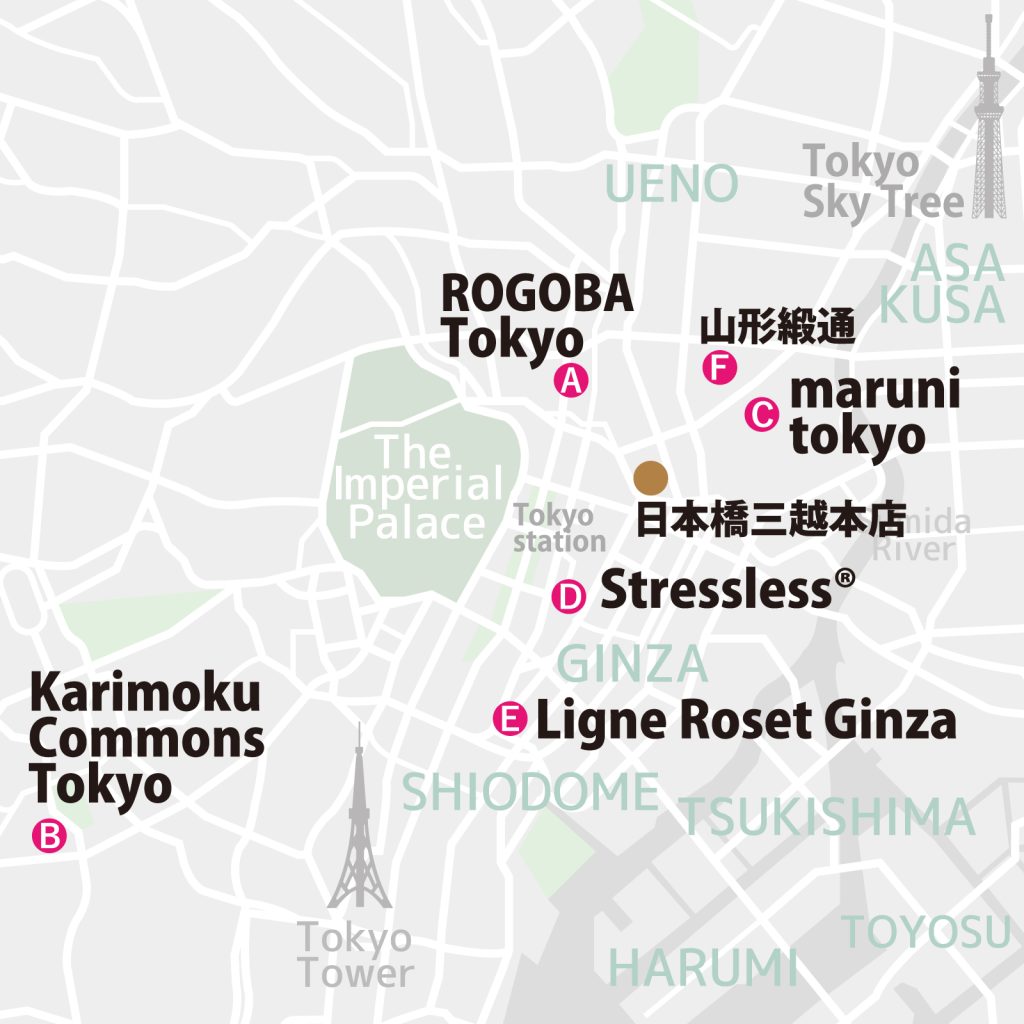 本企画では、日本橋三越本店を起点に、A_ROGOBA Tokyo、Karimoku Commons Tokyo、maruni tokyo、Stressless® Showroom Tokyo、Ligne Roset Ginza、山形緞通 東京ショールームなど、近隣ショールームとも連動。