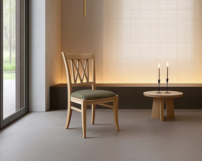 ホテルオークラ東京の内装を手がけたデービット・ヒックス氏のデザインと、永田良介商店が選定した塗装やファブリックが融合した一脚は、モダンデザインが「時間」を内包する存在であることを雄弁に語る。