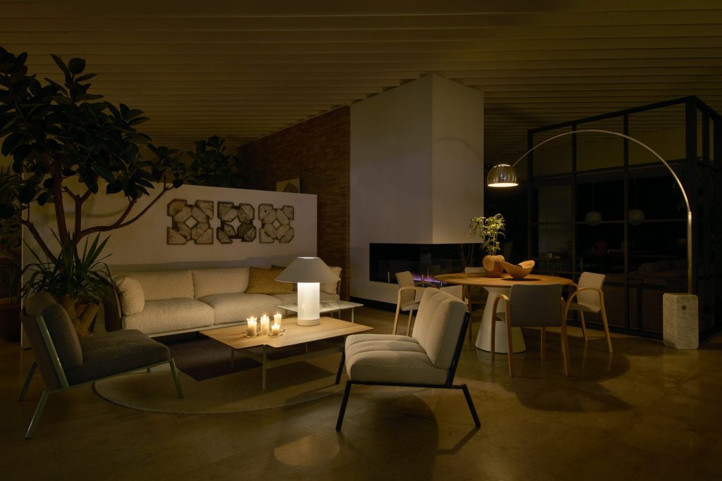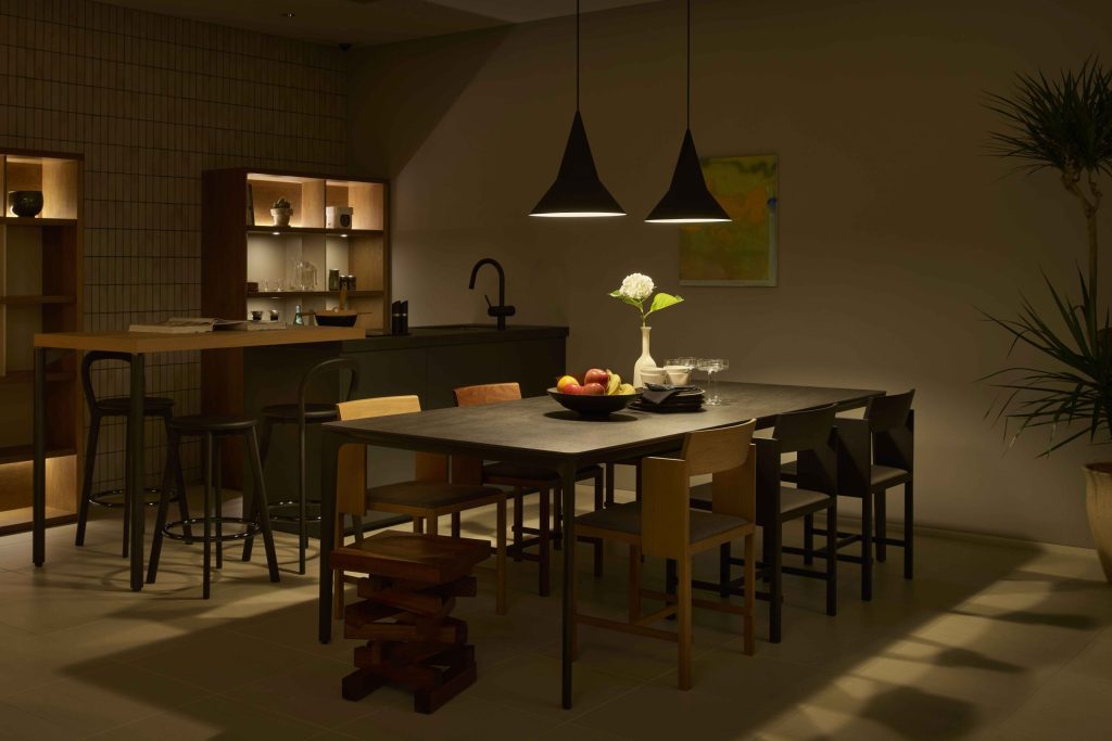 照度を抑えた「夜の住まい」を想定した空間で、テーブルランプ、ペンダント、ポータブルランプなど、多様な光のレイヤーが生み出す心地よさを体感できる。