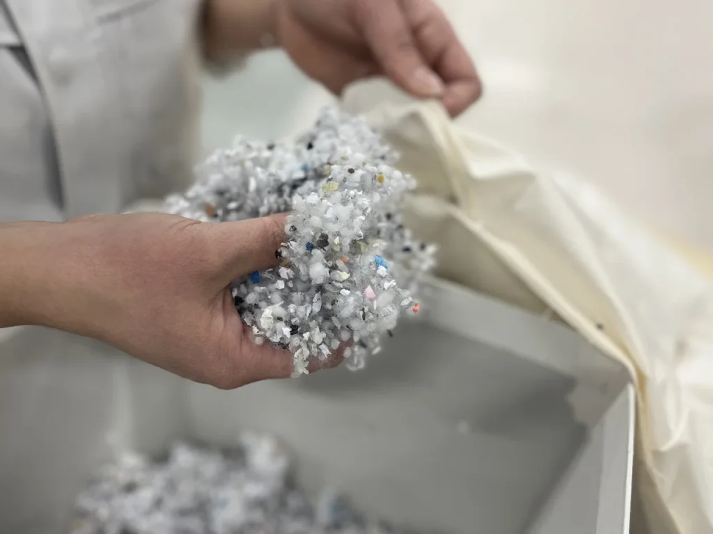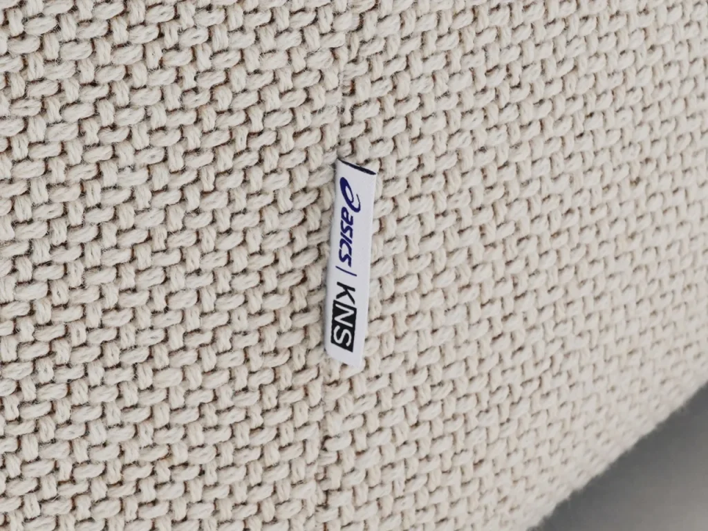 クッション構造には〈ASICS〉のシューズ「NEOCURVE」で用いられている技術を応用。シューズから分解・粉砕されたフォーム材(EVA)を、家具用素材として再構成し、フォーム材チップを混合した綿と、3mm厚のシートを組み合わせたハイブリッド構造を採用している。