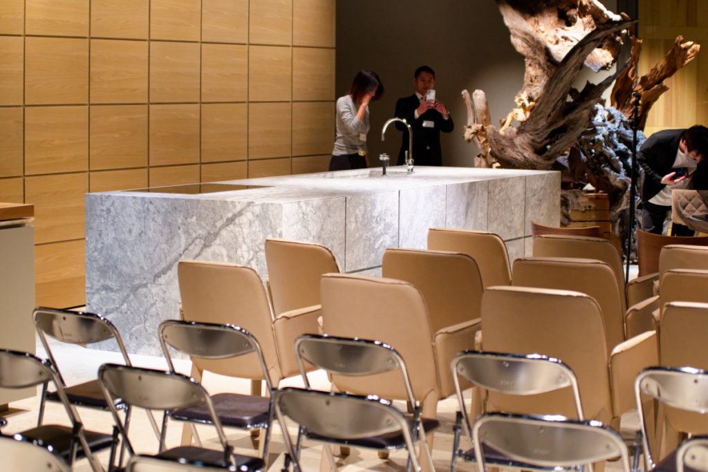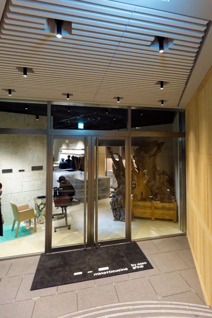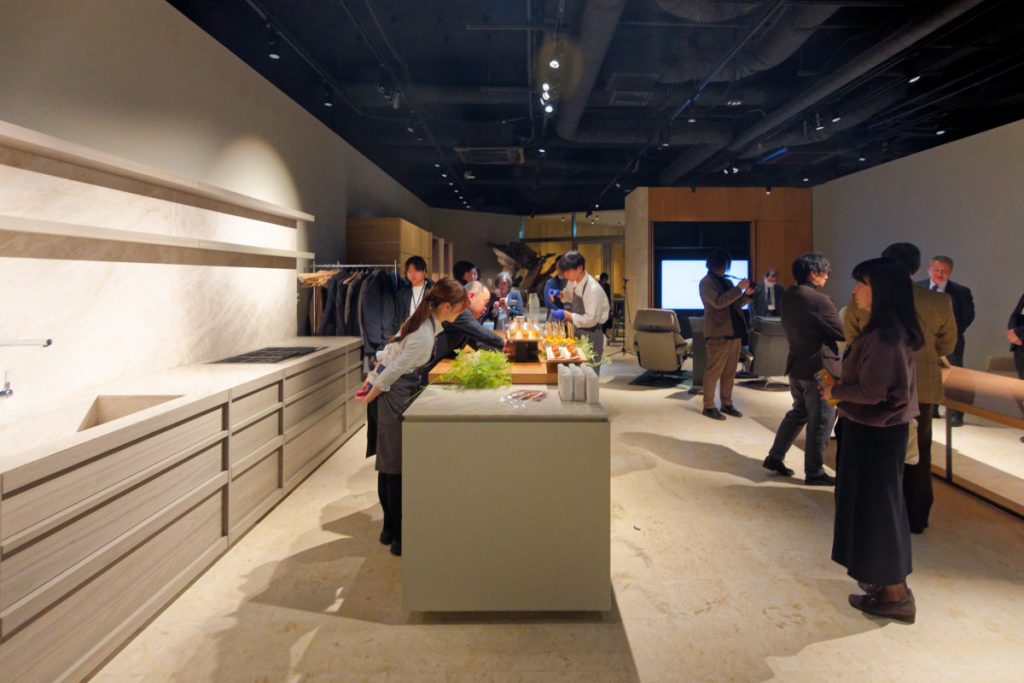 今回プレゼンテーション会場となったのは、地下一階にあるハイエンドシステムキッチンminotticucine(ミノッティクチーネ)のフロア。1949年創設のイタリアのキッチンメーカーで、2003年にいち早く天然石を使ったキッチンを発表しパイオニアとなった。