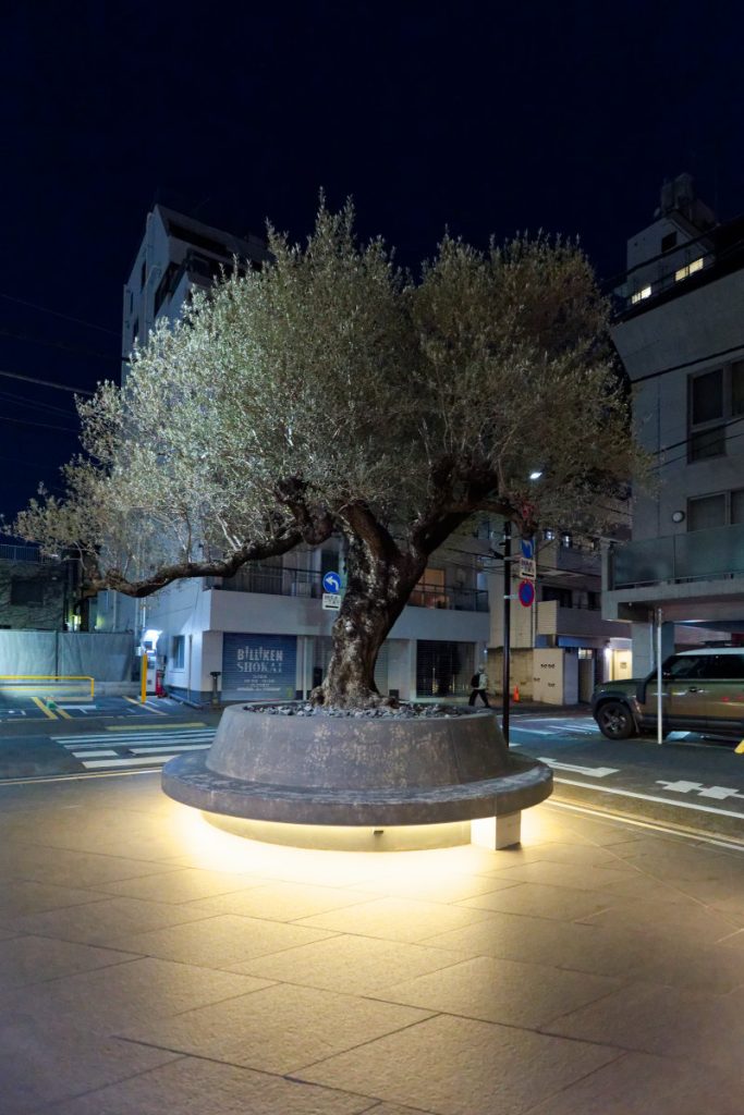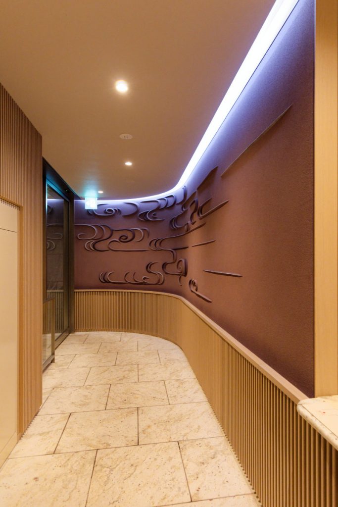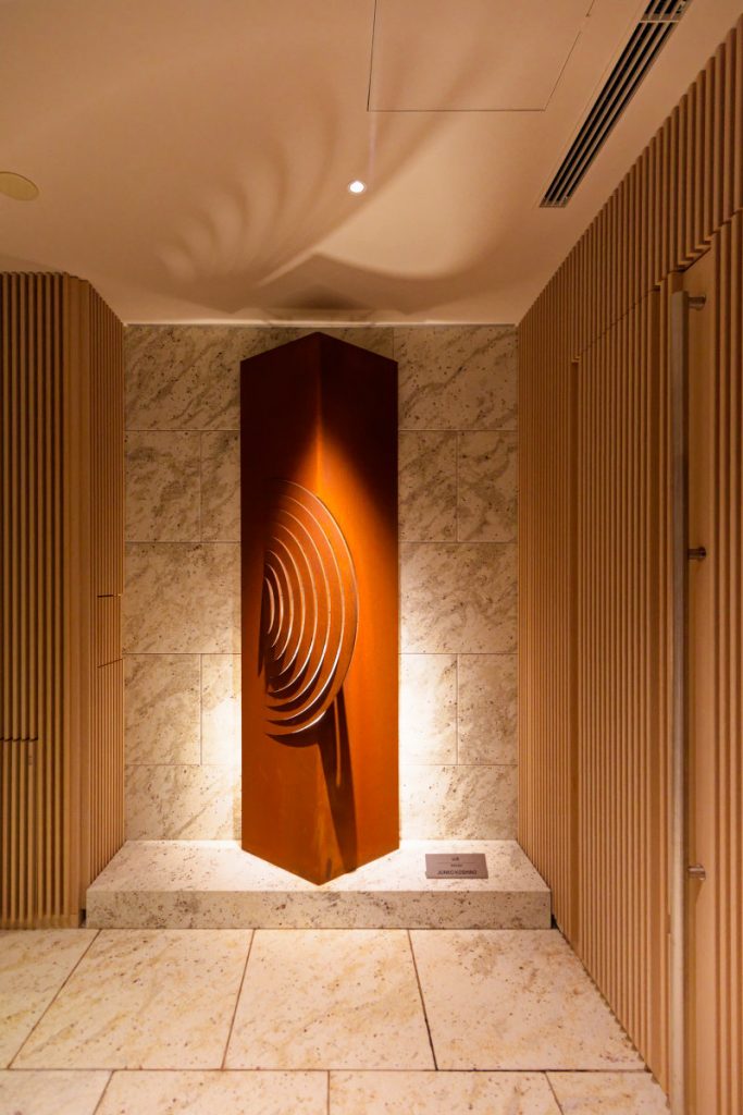 第一に、大河ドラマ「真田丸」で注目を浴びた左官・挾土秀平のエントランスや、コシノジュンコによるアート作品「山水」、各階のガラスの意匠といった節々に、流水紋があしらわれている点が挙げられる。また、後述する能楽堂の黒松とともに、エントランスにシンボルツリーとして西畠清順のオリーブが植えられるなど、単なる商業施設ではなく、「ちりばめられたアートによって刺激を受ける憩いの場にしたい」という分林さんの意向が色濃く反映されているのも見逃せない。