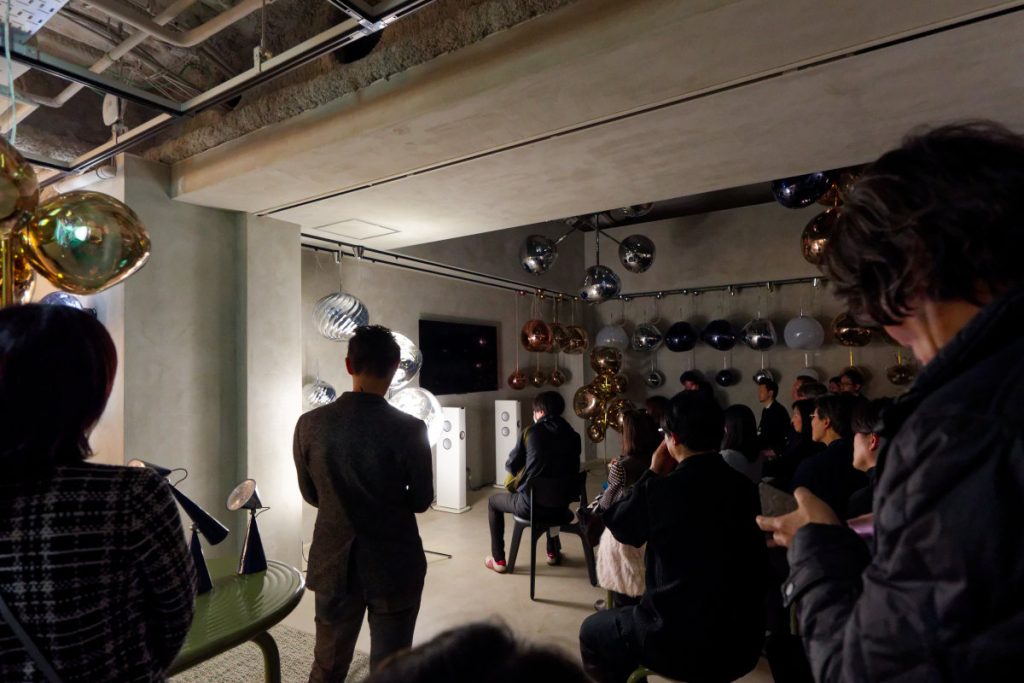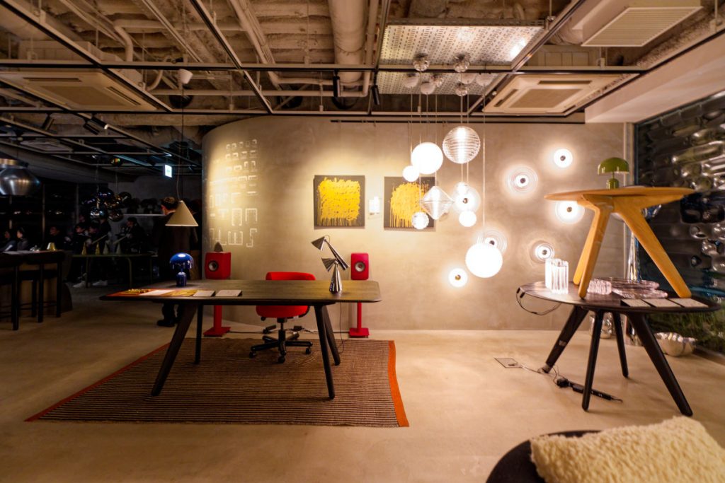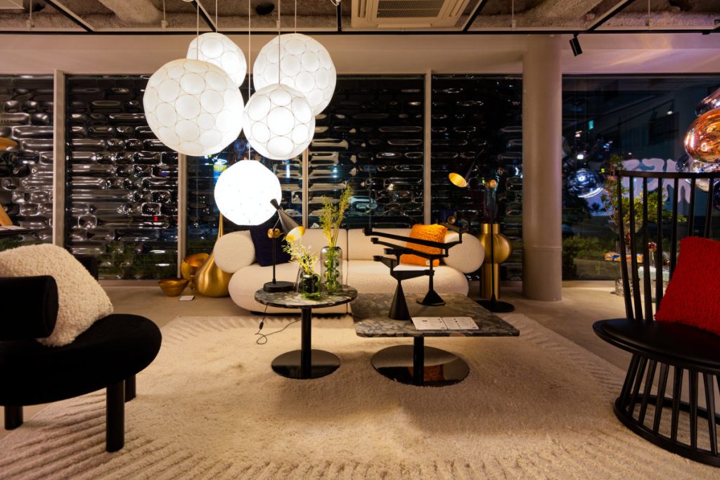 この青山ショールームにも、トム・ディクソンのアイコンがふんだんに並ぶ。吹きガラスのようなポリカーボネート真空蒸着処理の照明「MELT(メルト)」や、職人の技が光る真鍮の照明器具「BEAT(ビート)」が創る光のシーンに、もっちりした座り心地と丸みを帯びたフォルムのチェア/ソファ「FAT(ファット)」「LUMP(ランプ)」などが多彩なモジュールを生かして配置されている。