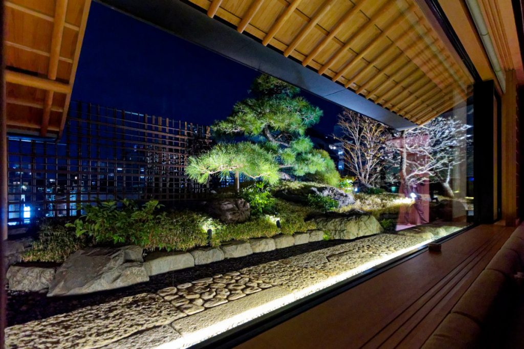 いちばんの特徴は、能舞台の正面奥に描かれた“鏡松”。元来、能舞台には欠かせないもので各々に個性があるが、4階にも関わらず、開口部の広い窓の外の庭には巨大な松が植えられ、それを見事に写し取っている。きけば日本画家が2ヶ月半通って描きあげたといい、分林さんの本家である京都の能舞台と兄弟松になるような配慮も施されているとのことだ。