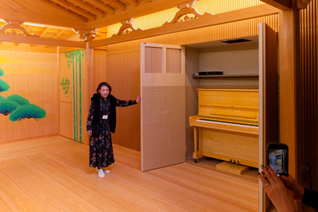 この能舞台は希にコンサートに使われることも。プロジェクターとスクリーンが備えられ映像も投写できるほか、日本に2台しかないスタンウェイのアップライトピアノが能舞台に合うメイプル仕様で設置されている。