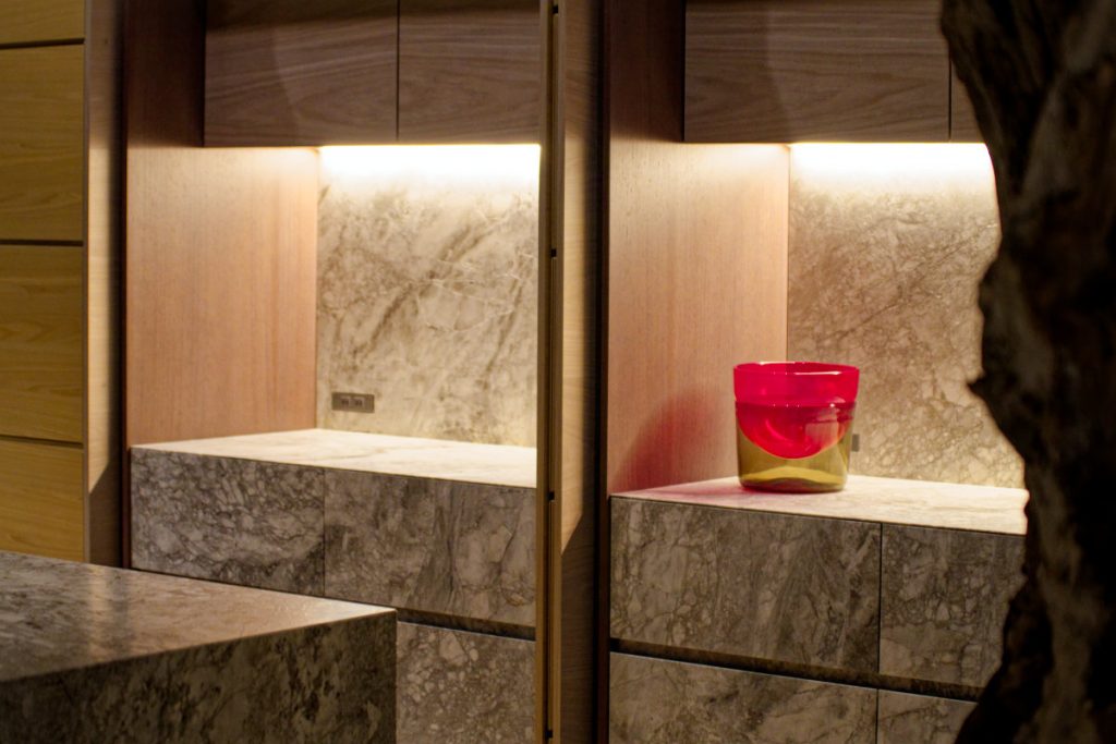 この完全予約制の南青山ショールームからも窺えるように、空間からは機能的な要素が視覚から徹底して排除され、自然界が長年培って描きあげたそのものをキャンバスにしたテーブルトップや扉が並ぶ。エントランスの流木と共に、美術館さながらの佇まいは壮観だ。