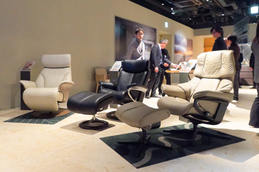 また、会場には北欧ノルウェーのエコーネス社のリクライニングチェアStressless(ストレスレス)も展示。2025年レッドドット・デザイン受賞の「Adam(アダム)」のほか、最も柔らかい座り心地の「Magic(マジック)」、ホームシアターの定番で包容力のある「Reno(レノ)」も展示され、来場者は座り心地の違いを体感していた。
