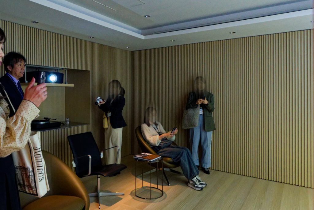 今回のイベントで注目されたのは奥のガラス張りの一角で、手許のタッチパネルをワンタッチすれば暗幕とスクリーンが下がり壁一面が180インチの大画面映像に早変わりするシアタールームだ。EPSON(エプソン)の高輝度4KハイエンドプロジェクターEH-QL3000の映像に、来場者は感嘆の声を上げていた。