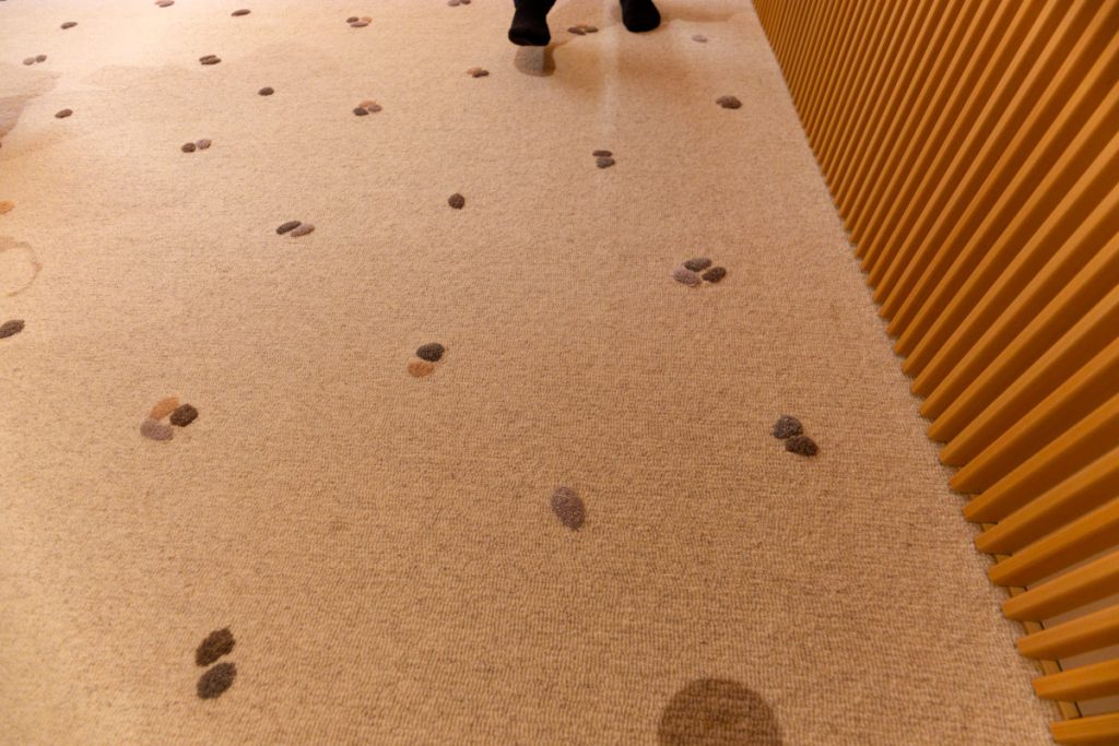 その徹底ぶりは、プライベートの能舞台では珍しい“屋根付き”であることからも窺える。ほかにも、塗料として貴重なインドの鉱石を使っていたり、松の枝振りを7-5-3のお目出たい数としたり、京都・修学院離宮の境内隣雲亭軒下のたたきに見られるひふみ石をカーペットで表現したりと、NAP中村さんとアイデアをぶつけ合った成果がふんだんに盛り込んまれている。
