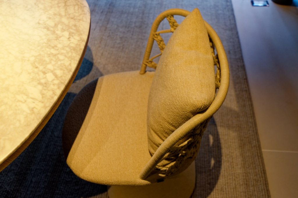 柔らかい丸みを帯びたデザインは60年代のドレスからインスパイアされたもので、チェアは構造体を重くしつつ回転式にして機能性を高めている。テーブル「Allura O'(アリュール オ)」も素材の組み合わせによって表情が変わり、ここではオークと大理石が組み合わされている。一部のチェア「Flair O’ (フレール オ)」は、カントゥという地域の伝統的なレース編みが用いられており、全体としてフェミニンな印象だ。