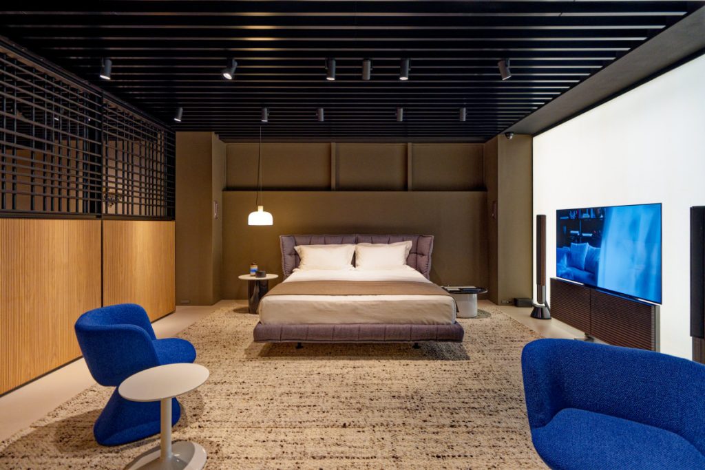 奥の一角はナイトシーン。B&B Italiaのスッキリしたベッドフレームは人気が高く、ここでは寝具も含めてコーディネートしたパッケージとして展示・販売されている。近年、不動産を購入する外国人は迅速な納品を求めることも多く、シーン全体をまとめて在庫しておくのだという。